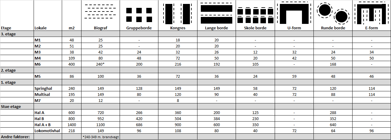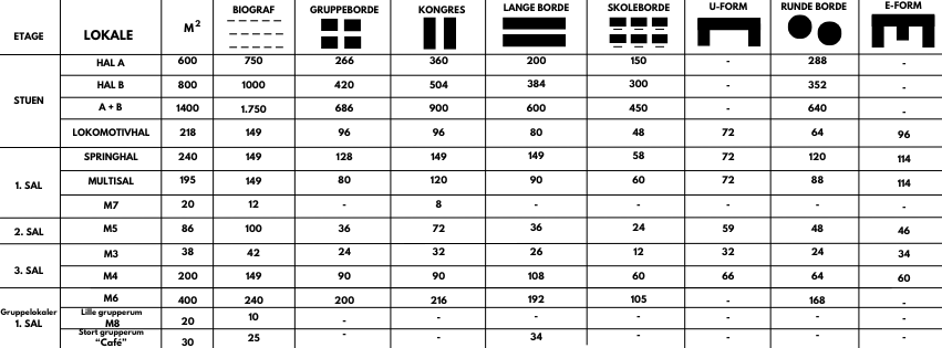 Se herunder en oversigt over vores facelitetr vi har til rådighed og deres kapacitet.