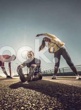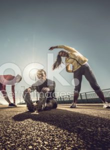 stock-photo-83644887-below-view-of-young-athletes-doing-stretching-exercises-on-road-
