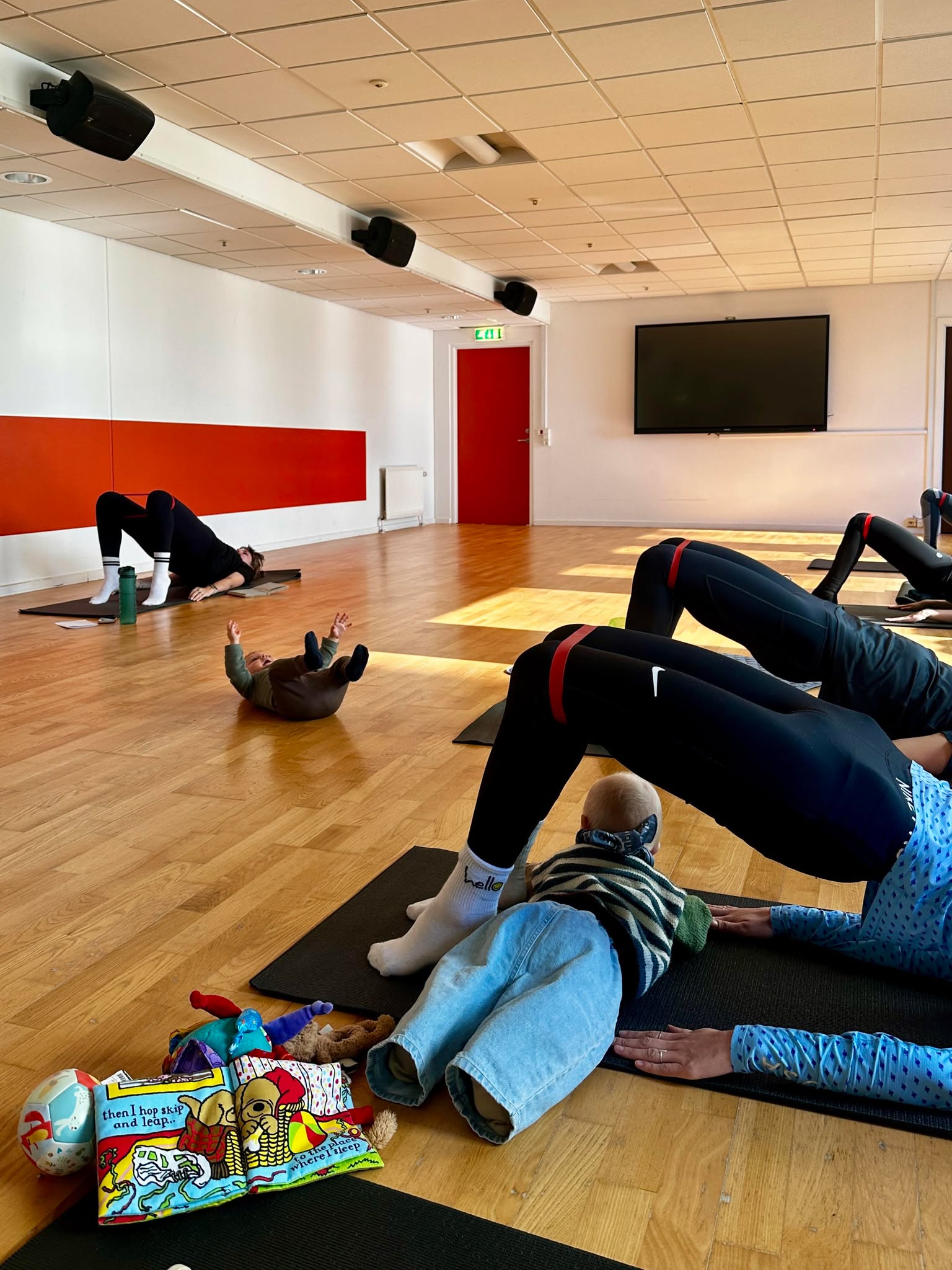 Baby er mere end velkommen til træningen og vil medvirke i nogen af øvelserne, for at give ekstra vægt men samtidig for at lege.